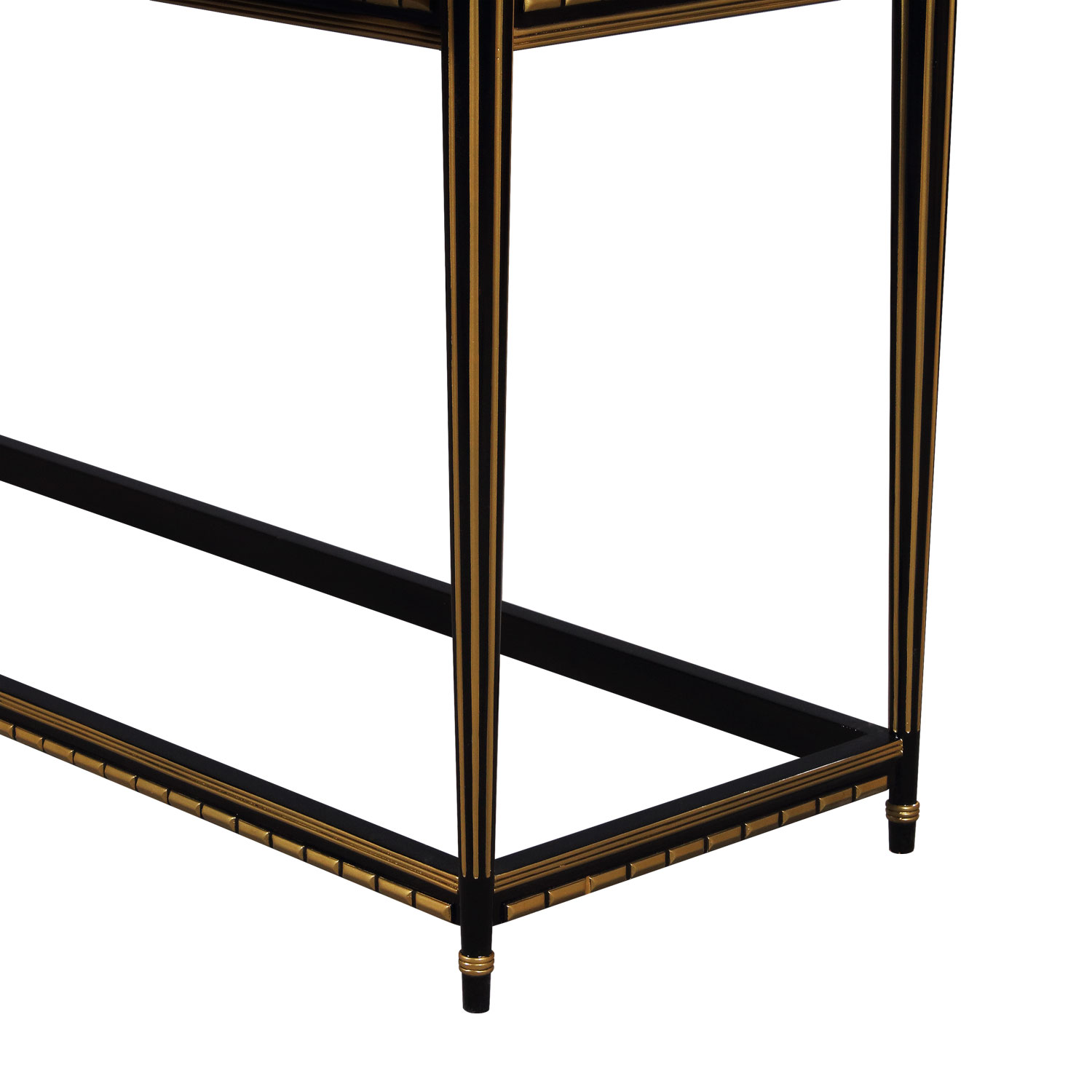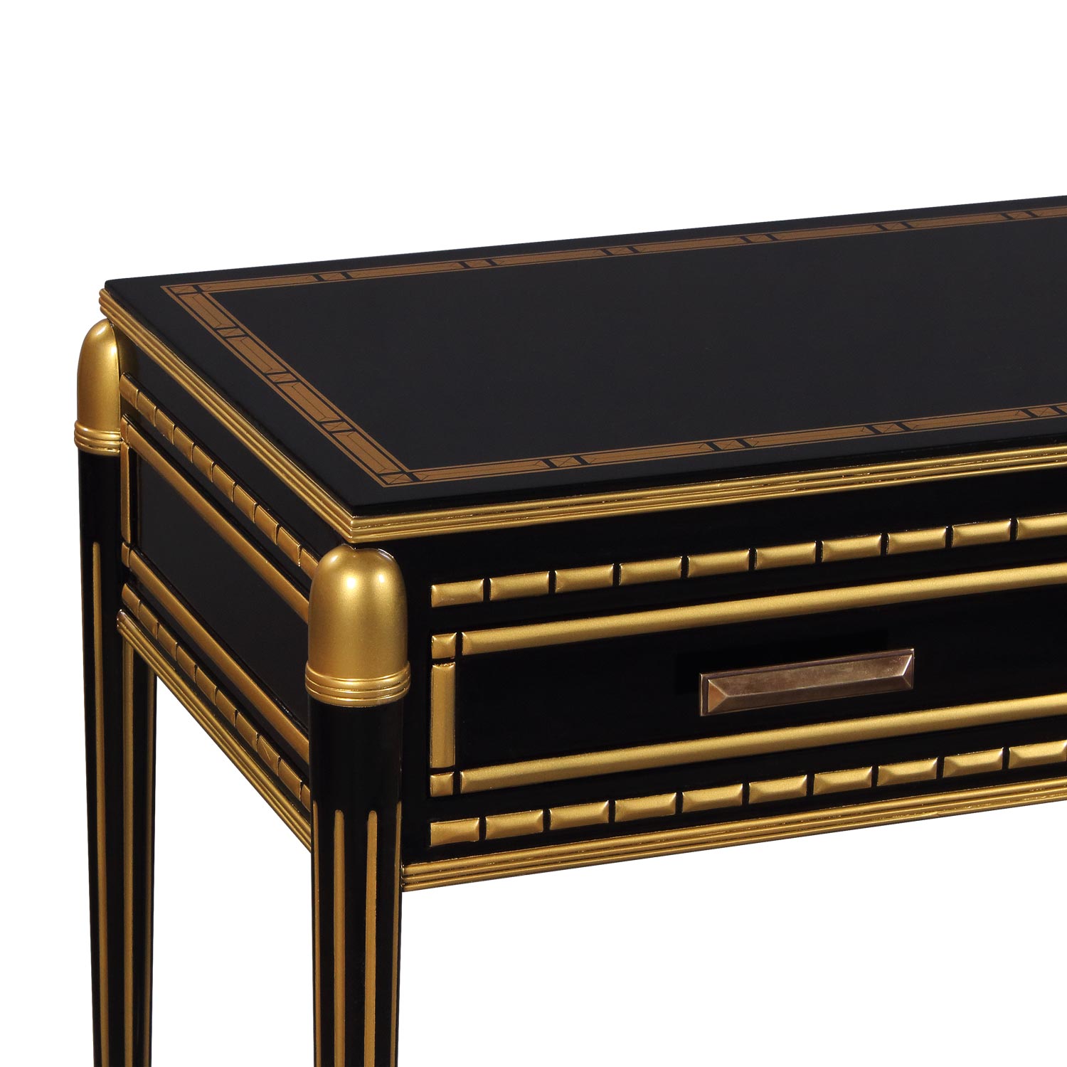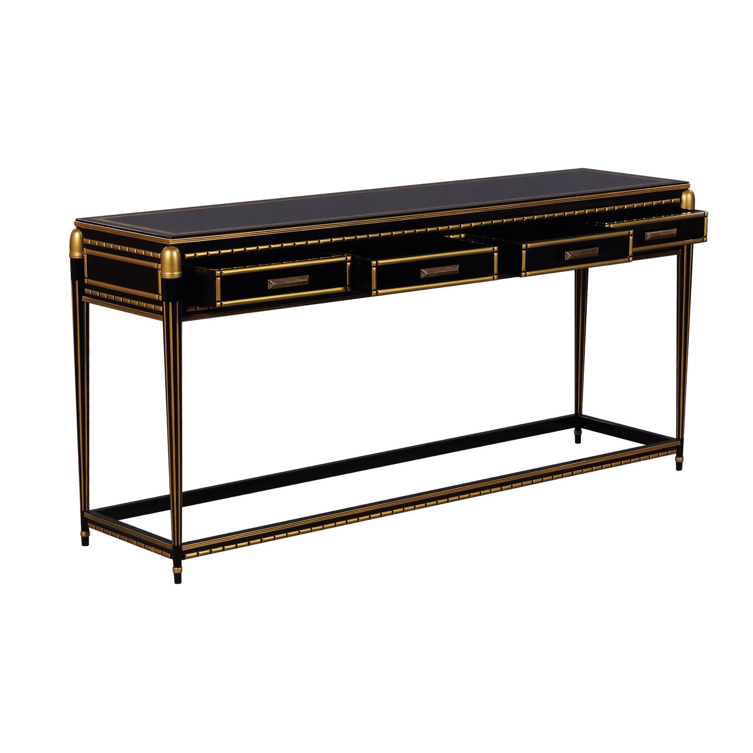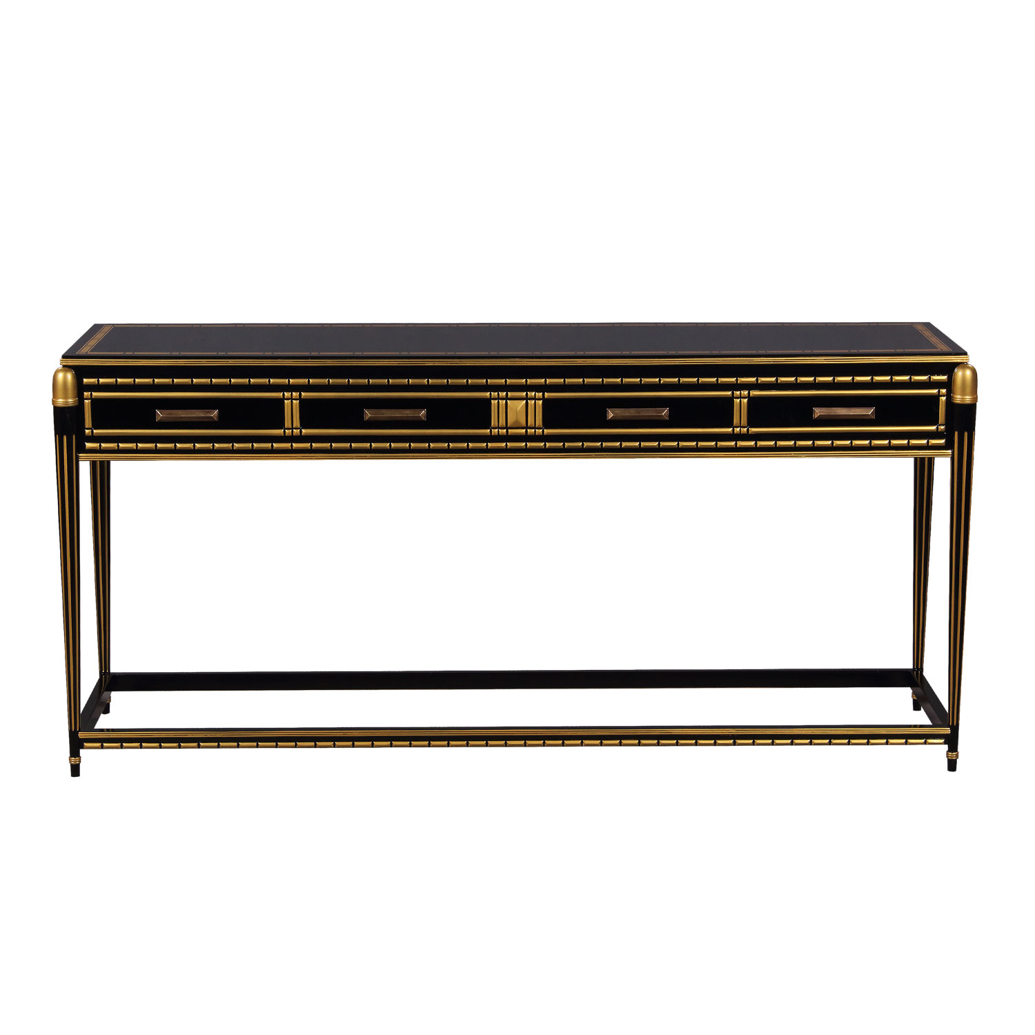 Part of the Cairo group: Mahogany Console in Art Deco style in special black and gold finish. Four drawers have brass pulls.