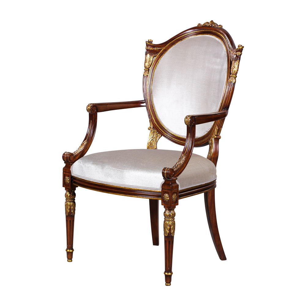 Louis XVI style dining arm chair shown here with gold leaf accents and in EM finish. Hand carved mahogany chair with large seating surface for optimal comfort. Can be matched with most of the dining tables.