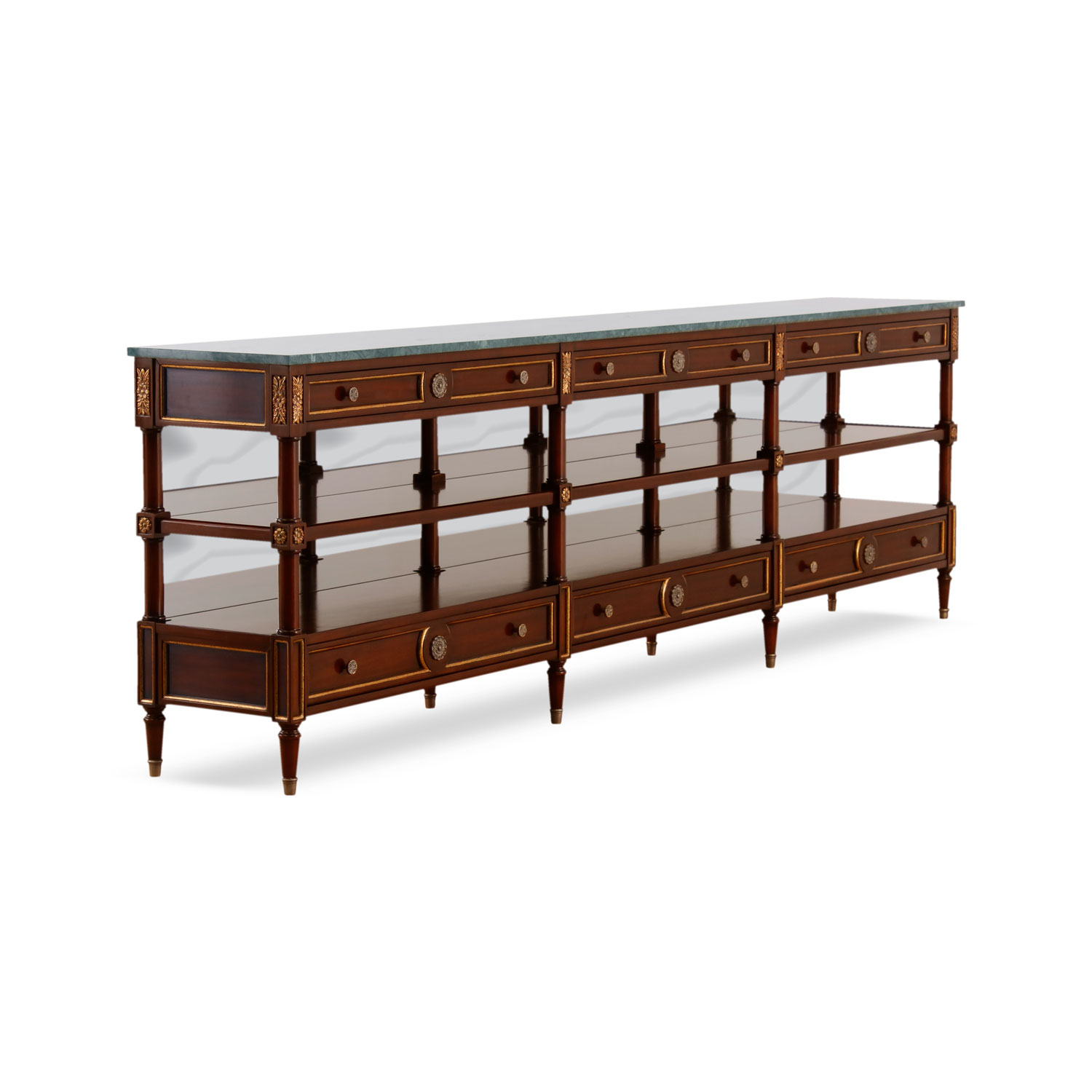 Featuring a luxurious green marble top, this table is adorned with hand-carved gilding in a stunning gilded accent, all meticulously crafted from high-quality mahogany wood.