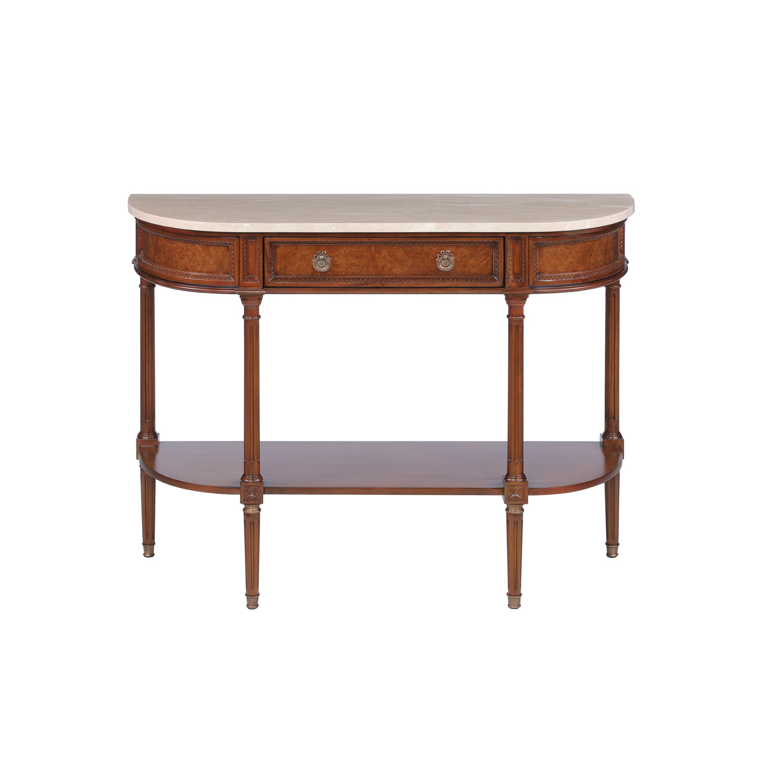 A classic console designed after Louis style. It has a full size marble top with curved sides. Decorated with hand carving on its rail, drawer and legs, also antique brass pulls and cups.