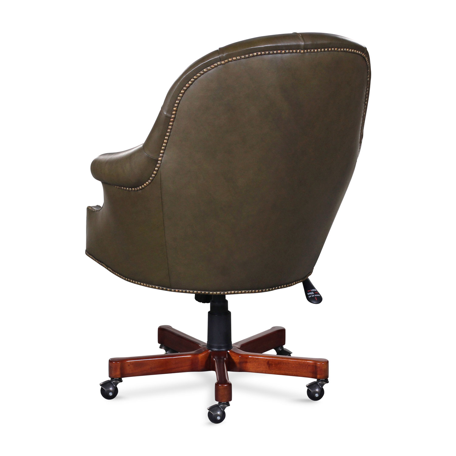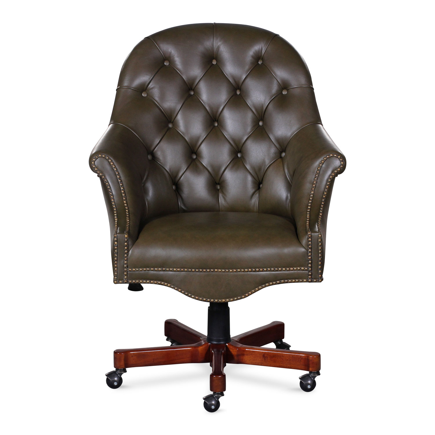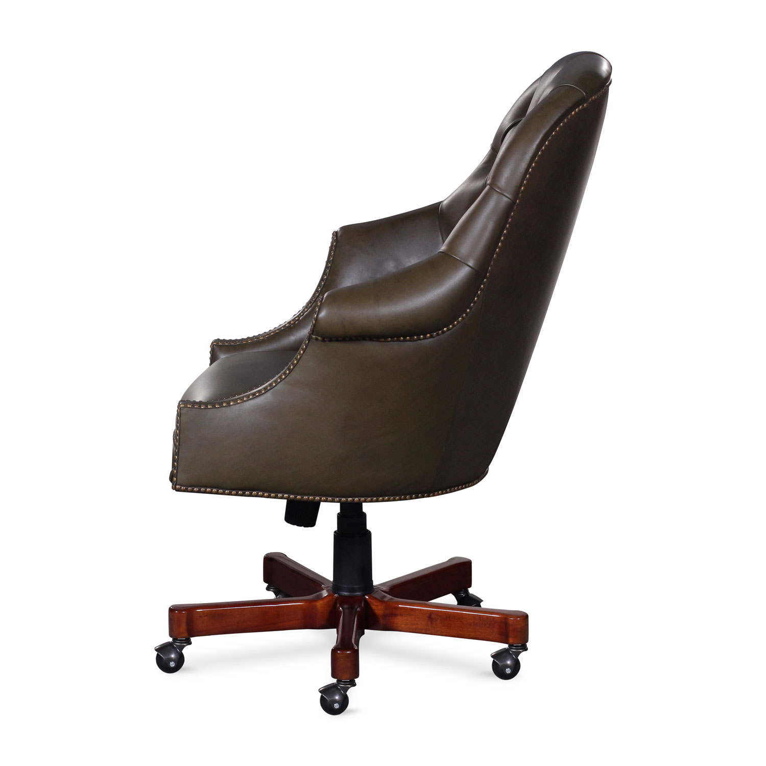 Office chair with mahogany base and modern casters. Tufted back and nail details.