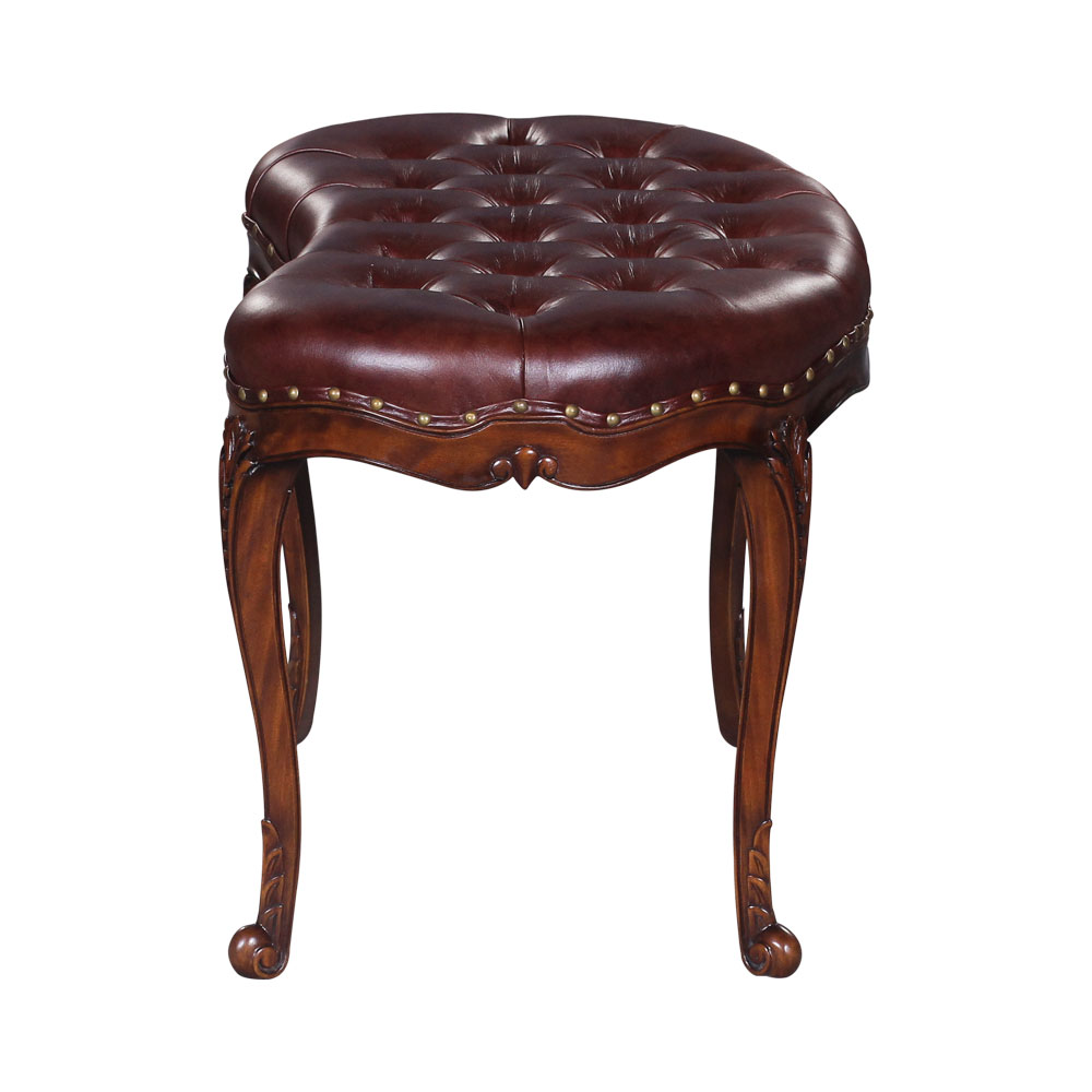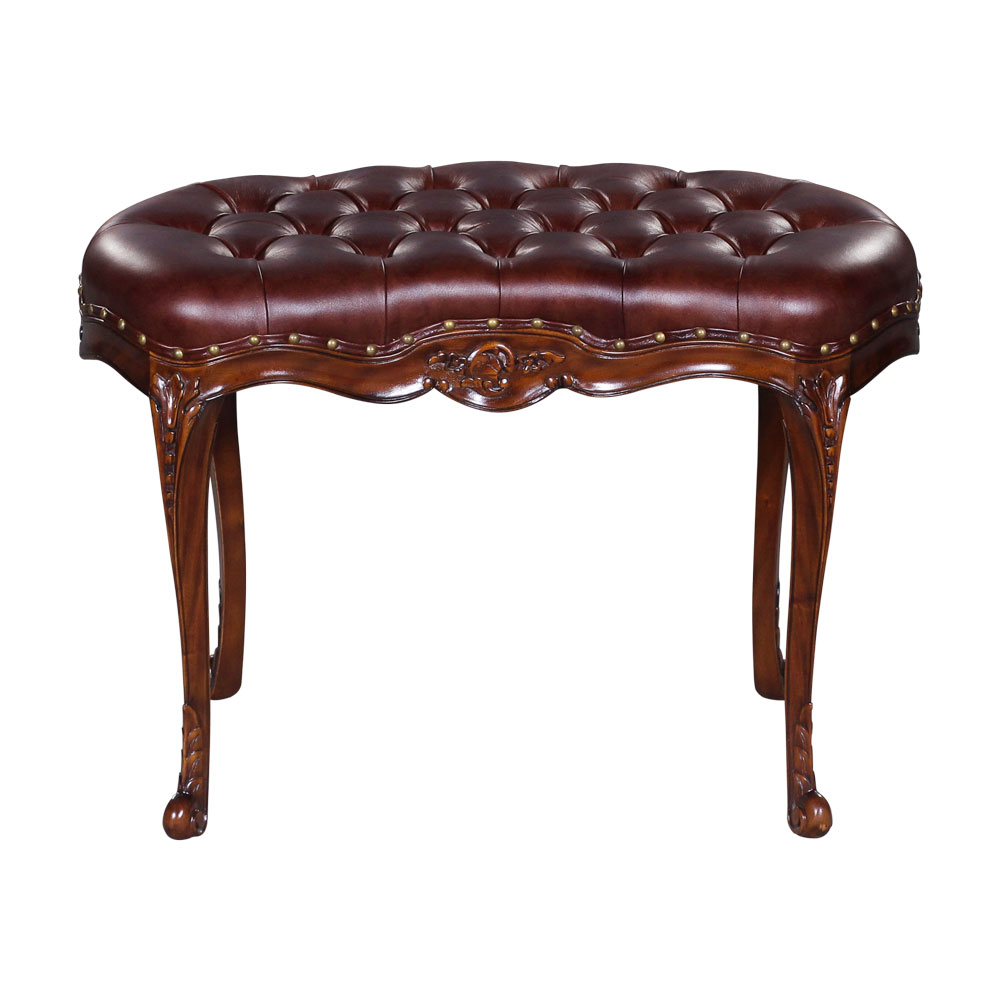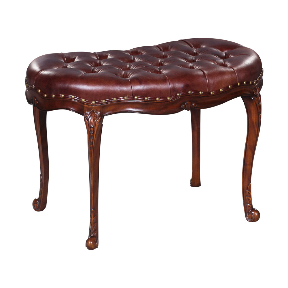 Beautiful french style stool with carved mahogany frame. Comes with thick tufted upholstery.